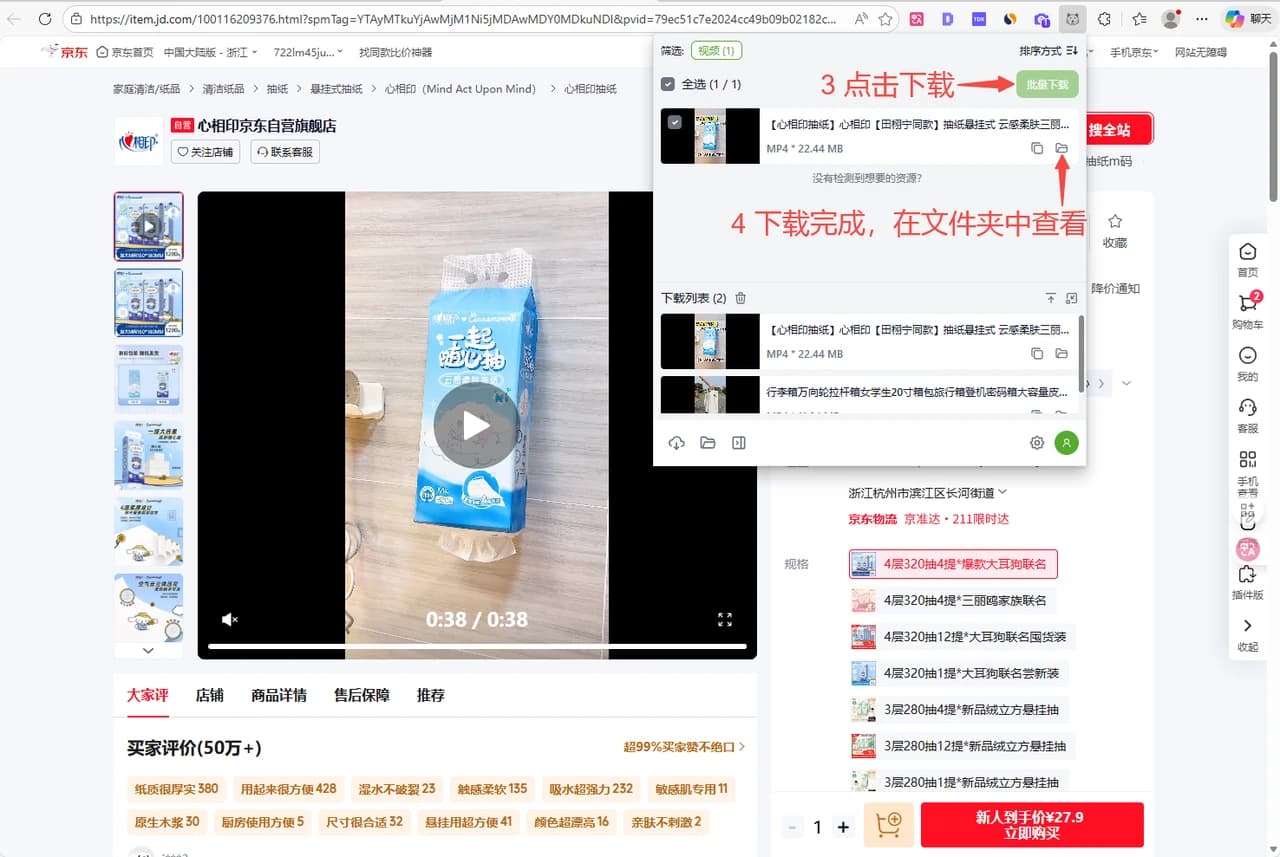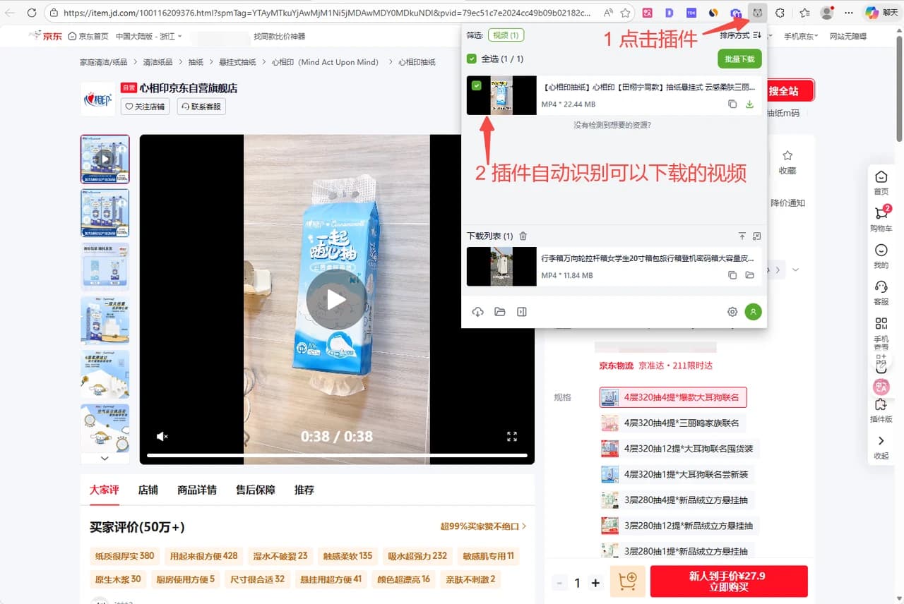 第一步:在浏览器中打开商品页面,插件会自动识别页面中的视频资源。